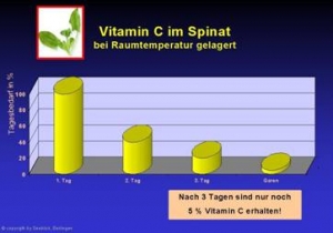Obst und Gemüse enthalten viele Mikronährstoffe − aber nur im frisch geernteten Zustand. Durch Transport, Lagerung, Konservierung und Kochen werden viele dieser wertvollen Mikronährstoffe zerstört. Ein Kopfsalat kann z.B. innerhalb von 3 Tagen bis zu 60% Vitamin C verlieren, Spinat bis zu 95% (siehe Grafik). Selbst wenn Sie täglich viel Obst, Gemüse und Salat essen, kann ein chronischer Vitalstoffmangel entstehen. Eine ausreichende Mikronährstoffversorgung ist eine entscheidende Basis für Gesundheit und Leistungsfähigkeit!